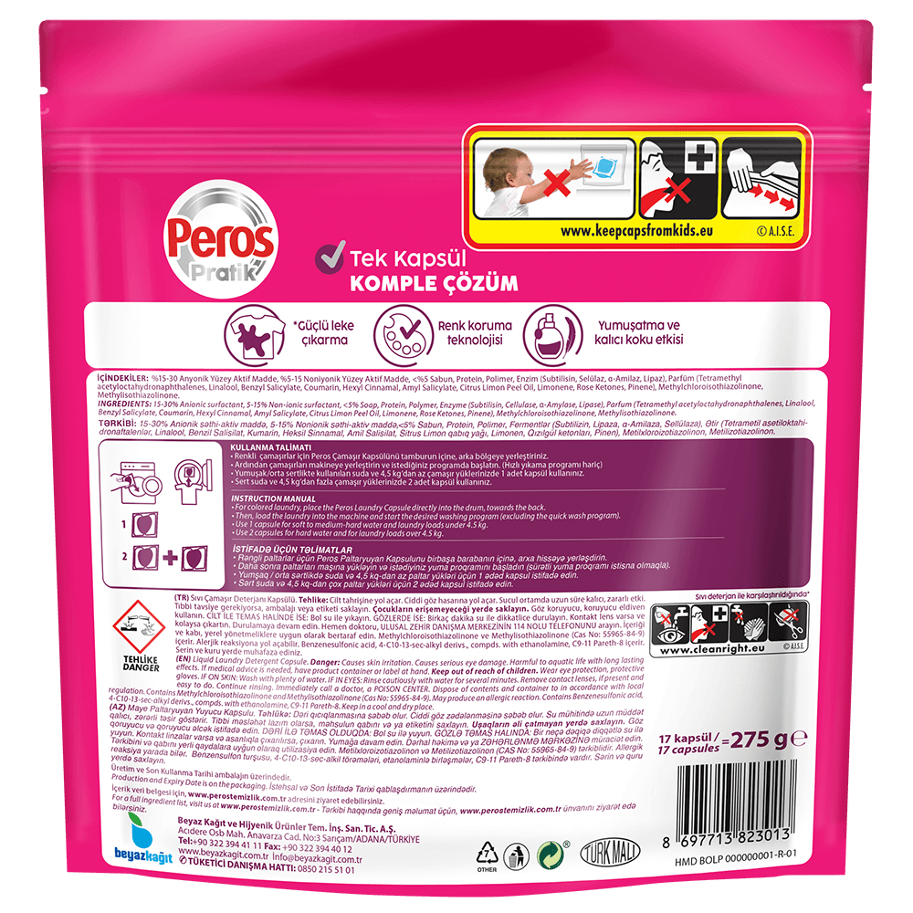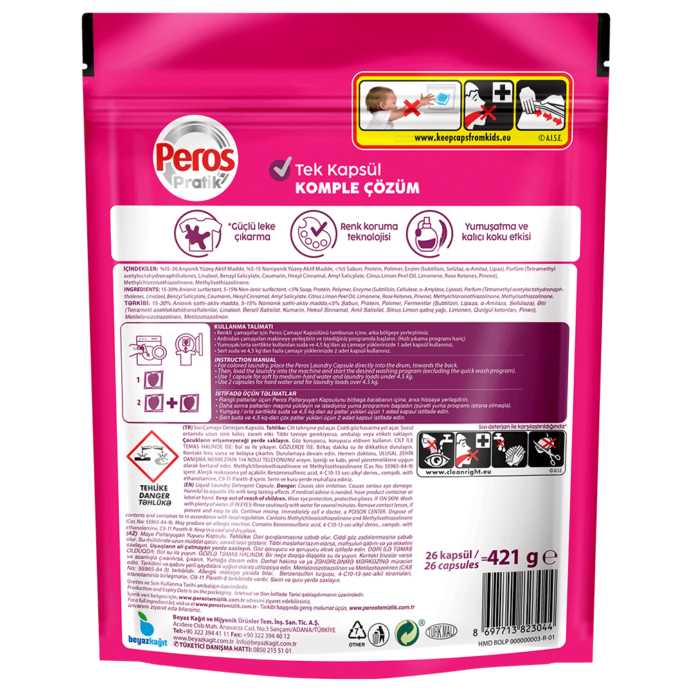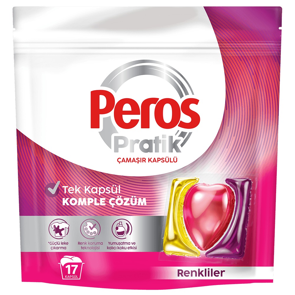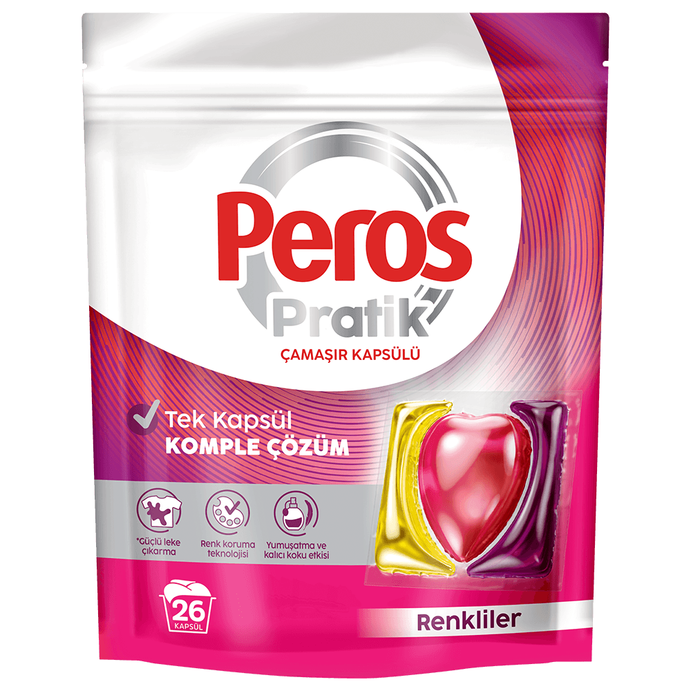Çamaşır yıkamayı zahmetsiz ve pratik bir deneyime dönüştüren Peros Pratik, inovatif kapsül teknolojisiyle tek hamlede etkili temizlik sunar. Ölçme, dökme ve taşıma derdi olmadan; güçlü temizlik performansı, renk koruma, yumuşatma ve kalıcı koku etkisini tek kapsülde bir araya getirir.