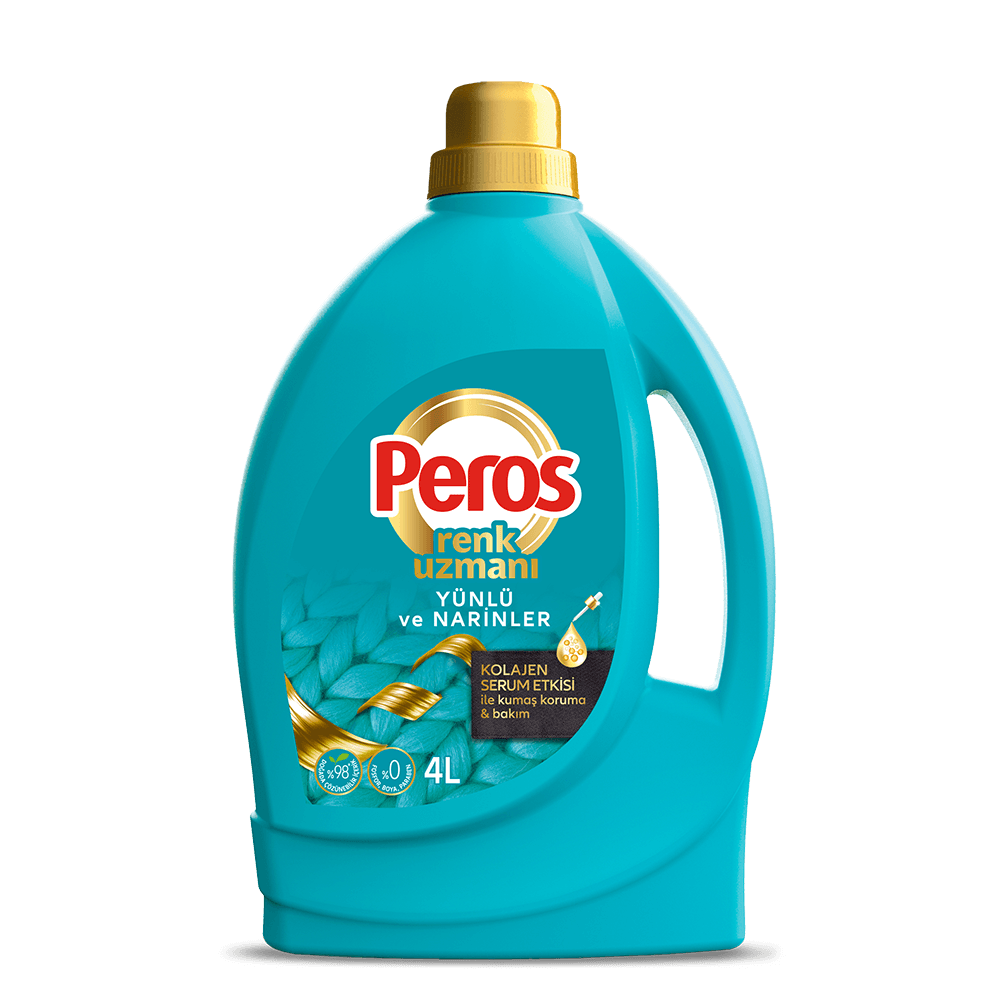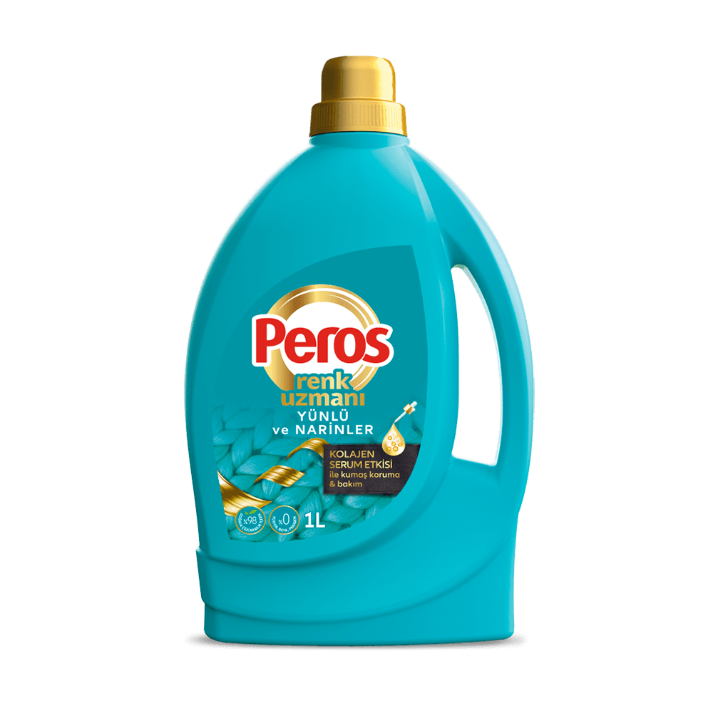 Yeni Peros Renk Uzmanı Sıvı Deterjan Serisi, giysilerinize ışıltı ve canlılık katmaya geldi! Renkliler, siyahlar, yünlü ne narinler için özel geliştirilen formülü ile Yeni Peros Renk Uzmanı giysilerinizi temizlemenin yanı sıra kolajen serum etkisiyle renkleri korur, giysileri bakımla yeniler. Yüzde doksan sekiz doğada çözünebilir içeriğe sahiptir. Formülünde fosfor, boya ve paraben bulundurmaz. Üstelik dermatolojik olarak onaylanmıştır.